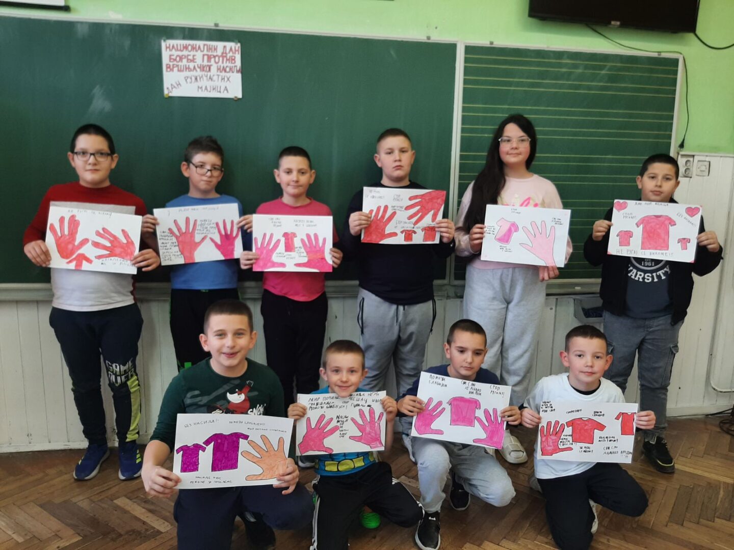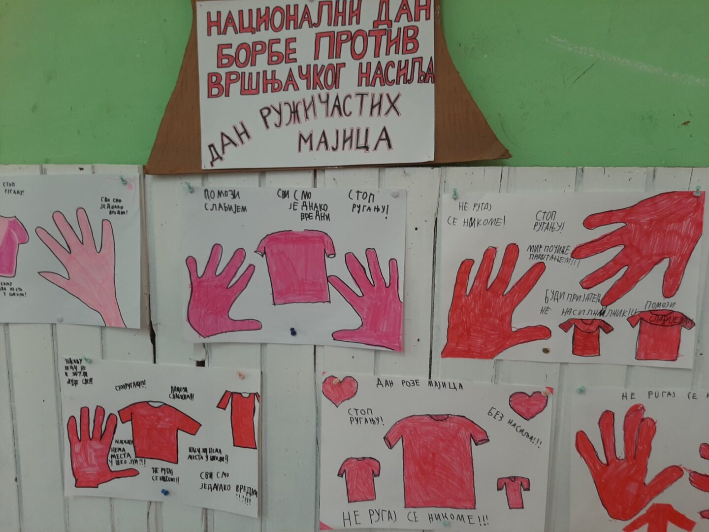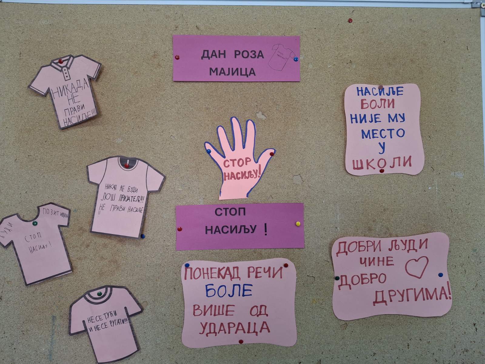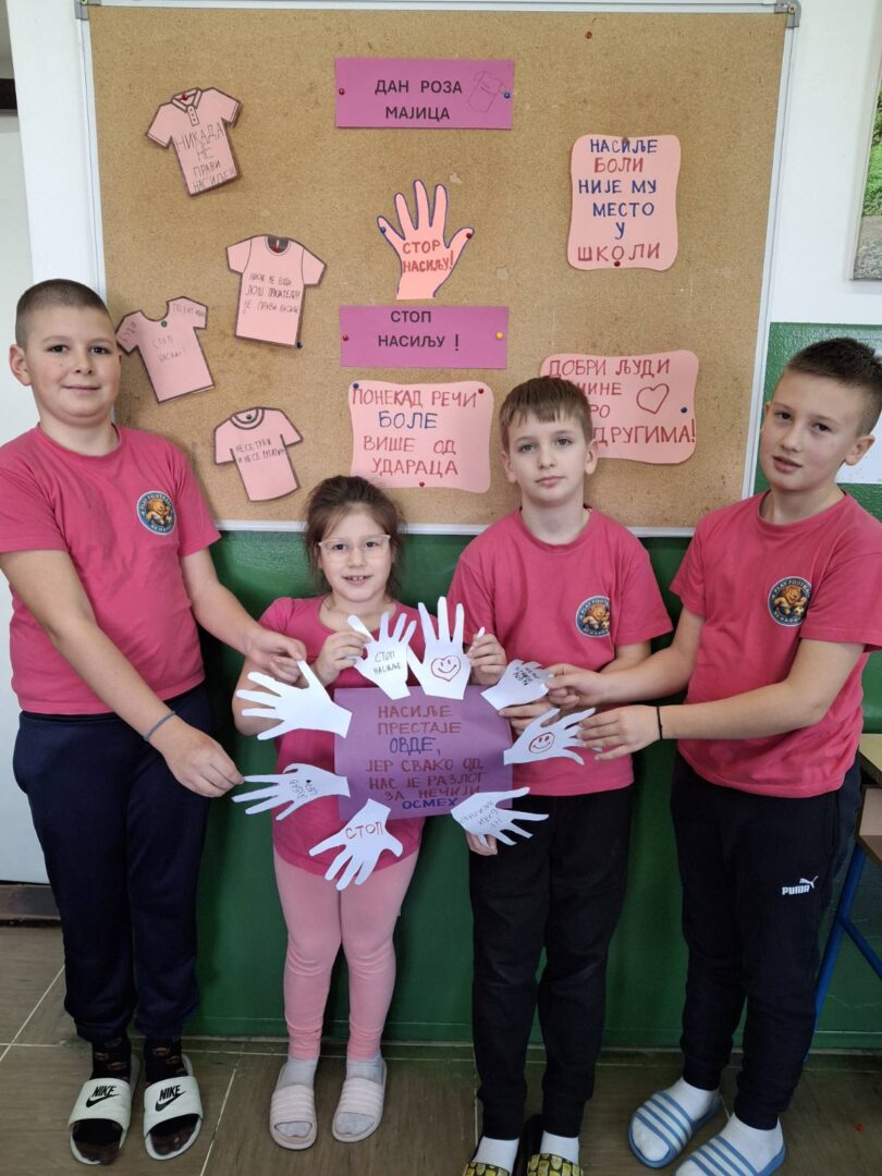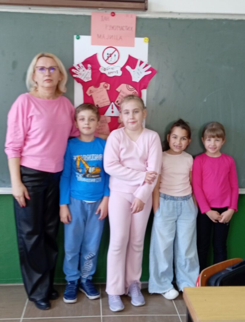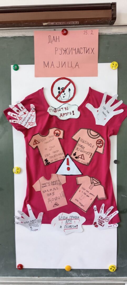 Последње среде у фебруару у нашој школи се обележава Дан ружичастих мајица. Овај дан смо обележили на часовима разредног старешине. Том приликом смо се подсетили зашто се овај дан обележава и која је његова порука, те смо израдили пригодне плакате и поруке којима смо једногласно поручили; „НЕ вршњачком насиљу!!!“