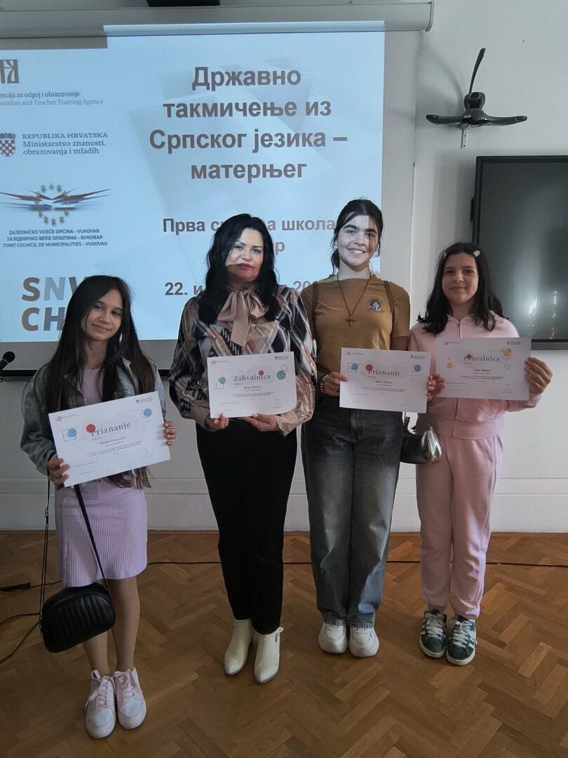 Ове године први пут је одржано Државно такмичење из српског језика за ученике који похађају наставу по моделу А и Ц у Републици Хрватској, у организацији Агенције за одгој и образовање. Наша школа имала је четири представника на овом такмичењу. Такмичење је одржано у Вуковару у Првој средњој школи Вуковар, 23. априла 2026. године. Ученице наше школе постигле су запажене резултате. Ученица Јелена Алавања из ПШ Пачетин, уз менторство учитељице Љиљане Ћосић, освојила је 3. место у 1. категорији- 4. разред основне школе, док су ученице шестог разреда Милица Миљевић и Дуња Степановић, уз менторство наставнице Сање Стојковић, поделиле 2. место у 2. категорији- 6.разред основне школе. Ученица шестог разреда Софија Малетић освојила је 6.место и заслужује посебну похвалу за свој труд и залагање. Нашим ученицама и њиховим менторима захваљујемо се на уложеном труду, као и на постигнутим резултатима, на које смо веома поносни.